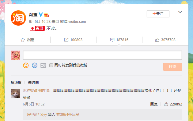 对此,淘宝官方微博在当日下午四点硬核回复了“不改”两个字。